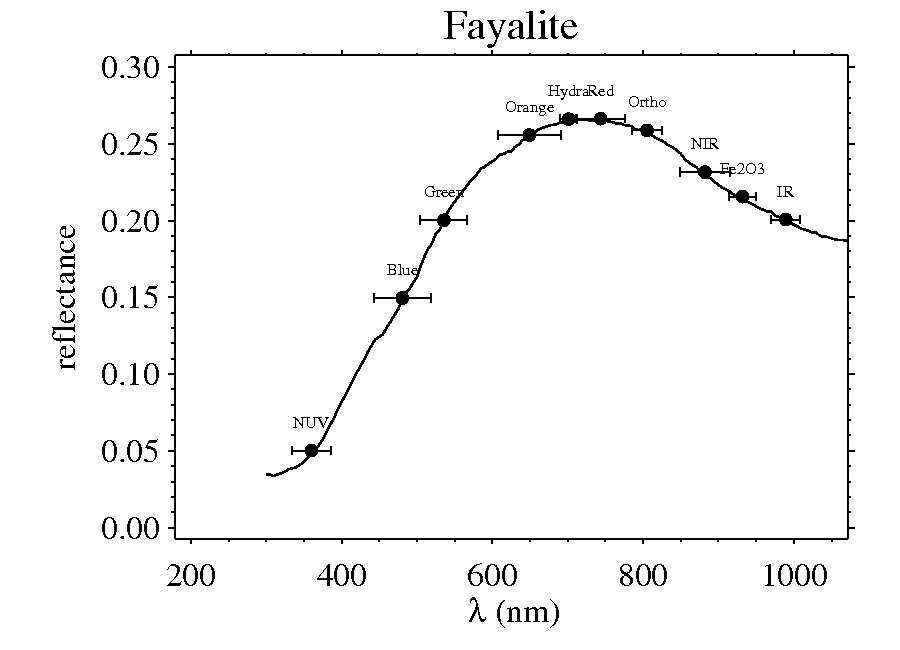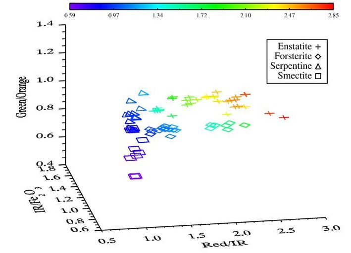 Cometary minerals are mainly Mg-rich silicates, mostly forsterite (olivine) and enstatite (pyroxene). Some hydrated/anhydrous silicates, sulfides, hydroxides and carbonates are selected according to the findings of Stardust mission and calibration materials of both GIADA and COSIMA intruments on board Rosetta. |